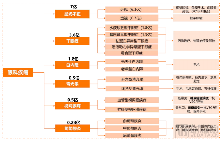 據(jù)Frost&Sullivan統(tǒng)計,2019年我國十大常見眼疾包括屈光不正、結膜炎、干眼癥、白內(nèi)障、瞼緣炎、視網(wǎng)膜疾病、斜視、弱視、青光眼及葡萄膜炎。其中,屈光不正、干眼癥的患者基數(shù)最大。僅我國近視及干眼癥患者數(shù)量便分別達到了6.3億及3.6億。但在眼科專病高度細分、專業(yè)性較強,消費者對眼科疾病的認知與重視程度有限等因素的限制下,我國眼科診斷率及治療率一直處于較低水平,眼科藥品及器械的發(fā)展也尚處早期。