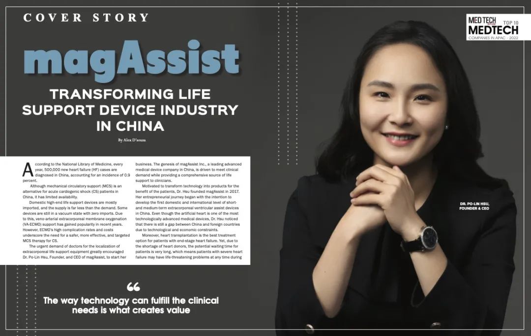 2023年1月,國際權威醫(yī)療科技雜志MedTech Outlook發(fā)布了2022年亞太地區(qū)醫(yī)療科技企業(yè)10強榜單(Top 10 Medtech Companies in APAC - 2022)。心擎醫(yī)療作為在生命支持領域中有突出貢獻的企業(yè),因其“以臨床需求為導向、以多產品線為醫(yī)者提供全方面支持”的理念與創(chuàng)新模式成功上榜,并被收錄于亞太區(qū)年度特輯封面故事。