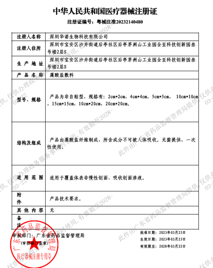 2023年3月23日,深圳華諾生物科技有限公司取得廣東省藥品監(jiān)督管理局批準(zhǔn)的藻酸鹽敷料的醫(yī)療器械注冊證。