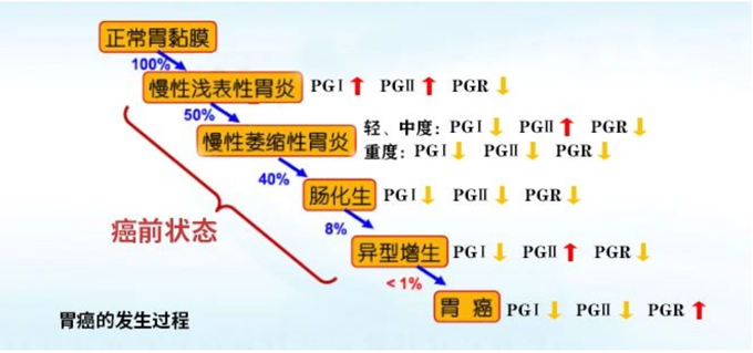 PGI、PGII、PGI和PGII比值的異常會提示不同的胃病,PG是淺表性胃炎、糜爛性胃炎、胃潰瘍、十二指腸潰瘍、萎縮性胃炎、胃癌等胃部疾病的初篩選指標和治療的監(jiān)控指標。PGI/II比值進行性降低與胃粘膜萎縮進展相關。因此,聯(lián)合測定PGI和PGII比值可起到胃底腺粘膜“血清學活檢”的作用。