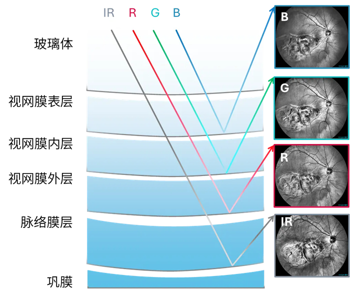 值得一提的是,這款設(shè)備采用了四波長激光(R/G/B/IR)分層掃描成像技術(shù),通過不同波長激光的掃描深度差異,能夠完整覆蓋眼底視網(wǎng)膜10層次組織結(jié)構(gòu)診斷區(qū)域,為醫(yī)生提供更廣、更全面、更深入的眼底臨床信息。