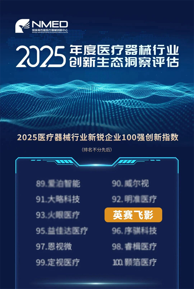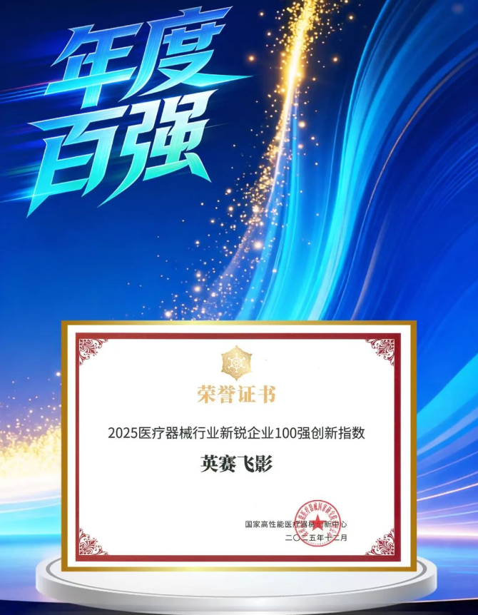 歷經(jīng)三個(gè)多月的征集、遴選與業(yè)內(nèi)資深專(zhuān)家的多輪嚴(yán)謹(jǐn)評(píng)審,英賽飛影憑借自研無(wú)線(xiàn)核心技術(shù)突破、全場(chǎng)景產(chǎn)業(yè)協(xié)同及高臨床價(jià)值落地,連續(xù)兩年榮登年度百?gòu)?qiáng),繼續(xù)上榜“2025醫(yī)療器械行業(yè)新銳企業(yè)100強(qiáng)創(chuàng)新指數(shù)”。