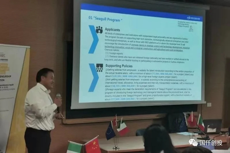 活動伊始,國仟創(chuàng)投投資合伙人陳豪博士在活動上發(fā)表了題為《中外投資環(huán)境分析》的主題演講。陳豪博士圍繞中國蘇州產(chǎn)業(yè)人才政策以及投資環(huán)境做了詳細講解,介紹了蘇州各個地區(qū)的產(chǎn)業(yè)優(yōu)勢及相關人才引進政策,如海鷗計劃、高技能人才計劃等,同時對于蘇州生物醫(yī)藥產(chǎn)業(yè)投資環(huán)境也做了詳實的介紹,項目代表們聽過后,對于未來落地中國蘇州產(chǎn)生了濃厚的興趣,并與會后與陳博士進行了深入了交流,陳博士耐心解答了意方團隊關于在中國蘇州落地的一些具體問題。