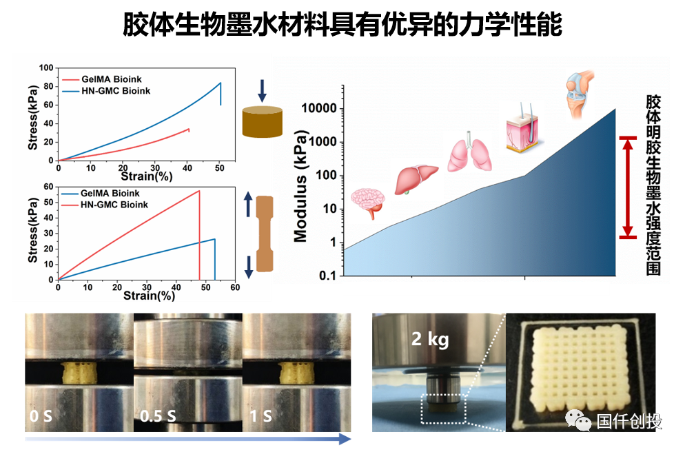 相同質(zhì)量分?jǐn)?shù)的HN-GMC水凝膠力學(xué)強(qiáng)度顯著優(yōu)于傳統(tǒng)的GelMA水凝膠墨水,并且HN-GMC墨水的力學(xué)強(qiáng)度在大范圍可控。