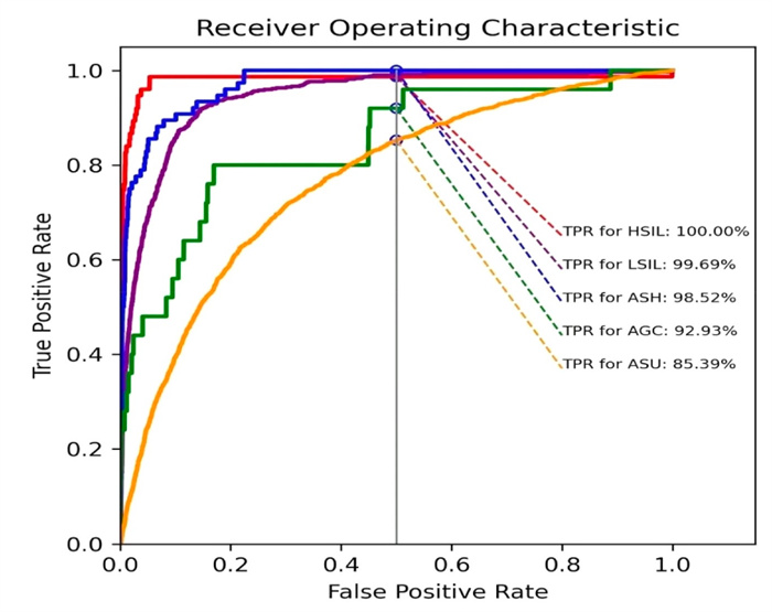 圖示為ROC 曲線:對(duì)于50%的排陰率,即在假陽(yáng)性率(FPR) 為0.50時(shí),繪制一條垂直線與每條ROC曲線相交,相交點(diǎn)的y值對(duì)應(yīng)于相應(yīng)的靈敏度或特異度。結(jié)果顯示,對(duì)于HSIL 、LSIL、ASC-H、AGC和ASC-US玻片,靈敏度分別為 100% 、99.69%、98.52%、92.93%和85.39%。