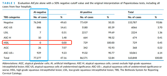 在四家醫(yī)院總數(shù)為16萬(wàn)例的樣本研究中,當(dāng)AICyte®設(shè)置排陰率為50%時(shí),高級(jí)別鱗狀上皮內(nèi)病變HSIL,無(wú)一例漏診。