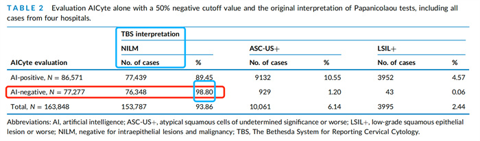 通過(guò)與歷史診斷結(jié)果,即標(biāo)準(zhǔn)TBS報(bào)告內(nèi)容的對(duì)照分析,單獨(dú)使用AICyte®判讀結(jié)果的陰性符合率為98.8%。