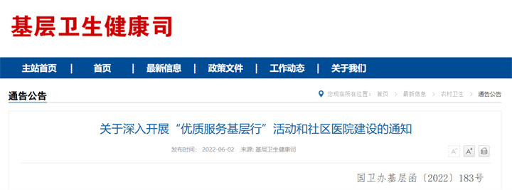 2022年6月,《關(guān)于深入開展“優(yōu)質(zhì)服務(wù)基層行”活動(dòng)和社區(qū)醫(yī)院建設(shè)的通知》(國(guó)衛(wèi)辦基層函〔2022〕183號(hào))印發(fā),其中明確“十四五”期間,力爭(zhēng)使鄉(xiāng)鎮(zhèn)衛(wèi)生院、社區(qū)衛(wèi)生服務(wù)中心普遍達(dá)到服務(wù)能力基本標(biāo)準(zhǔn),部分達(dá)到推薦標(biāo)準(zhǔn)。