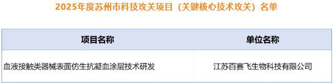 近日,2025 年度蘇州市科技攻關(guān)項目(關(guān)鍵核心技術(shù)攻關(guān))名單公布,江蘇百賽飛生物科技有限公司 “血液接觸類器械表面仿生抗凝血涂層技術(shù)研發(fā)” 項目成功入選。