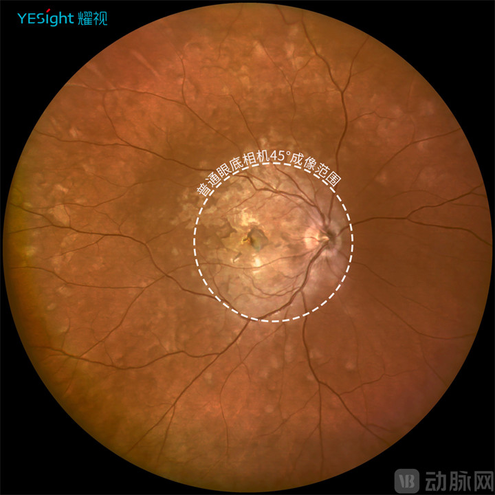 傳統(tǒng)眼底彩照45°成像范圍VS耀視168°成像范圍