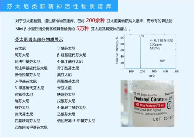 對于芬太尼檢測,通過標準物質建庫,已將200余種芬太尼類物質納入譜庫,而專有的算法使Mini β小型質譜分析系統(tǒng)具備檢測約5萬種芬太尼及其變體的能力。